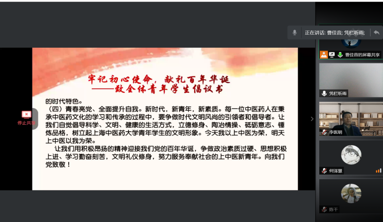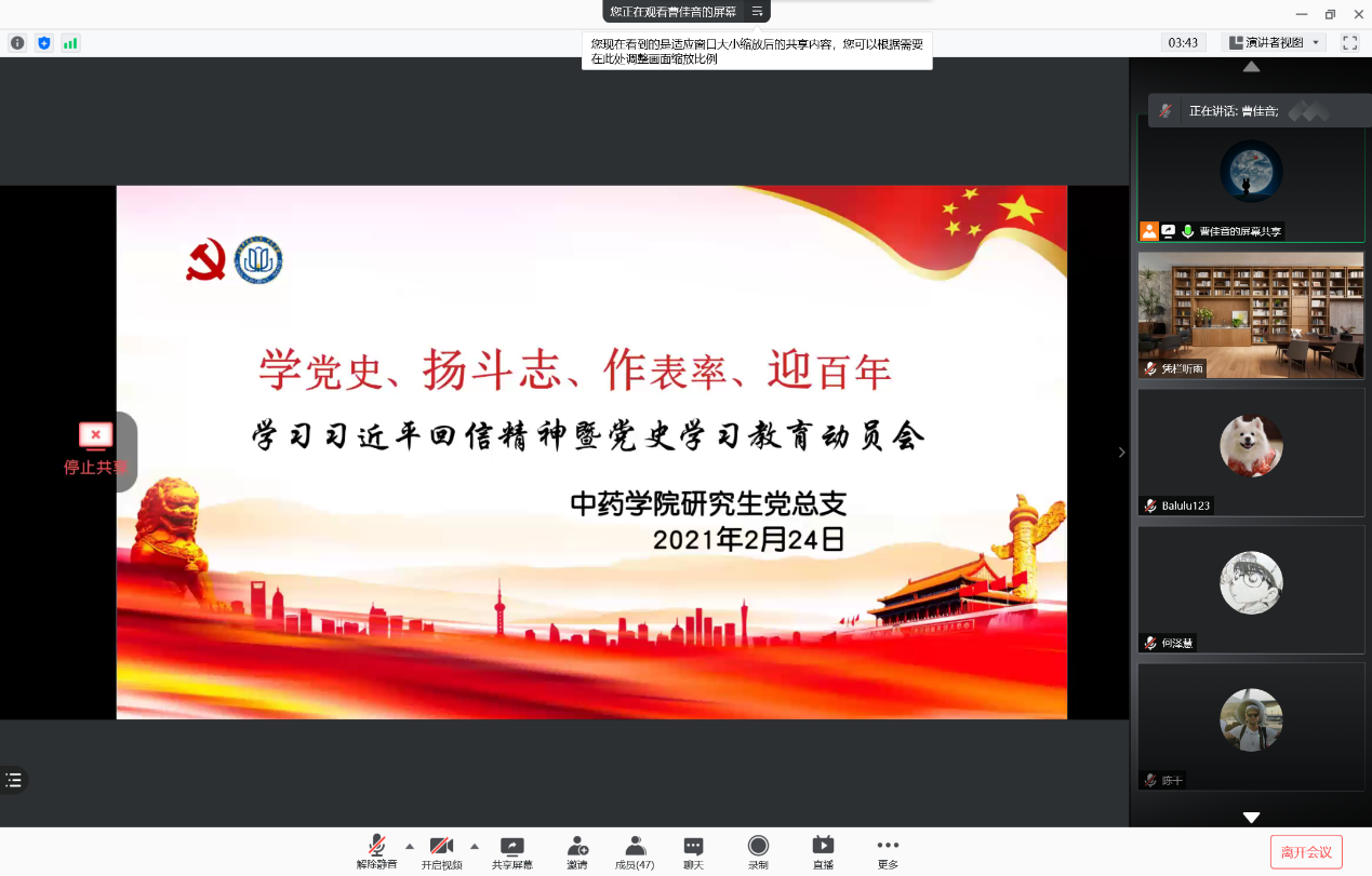 2021年2月20日,党史学习教育动员大会在北京召开,习近平总书记强调,在全党开展党史学习教育,全党同志要做到学史明理、学史增信、学史崇德、学史力行,学党史、悟思想、办实事、开新局。为庆祝中国共产党百年华诞,号召中药学子牢记初心使命,倡议全体青年在新时代接续奋斗,以党史学习教育动员大会为遵循,2月24日,88娱乐城 研究生党总支举行党史学习教育动员大会,88娱乐城 党委书记李医明老师,党委副书记沈漫老师,研究生党总支书记陈秀兰老师出席,会议由总支组织委员曹佳音主持,研究生党总支全体党员参会。