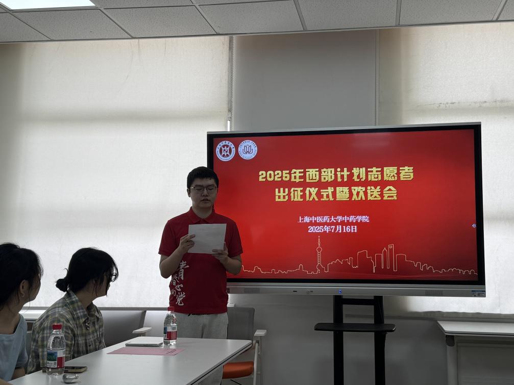 7月16日上午,88娱乐城 在9403会议室为西部计划志愿者杨境哲同学隆重举行出征仪式暨欢送会。88娱乐城 党委书记车荣华、院长张彤、党委副书记陆婧,辅导员、学生代表共同出席。仪式上,张彤院长高度赞扬了杨境哲响应国家号召、服务西部的奉献精神,鼓励他在实践中锤炼本领,服务人民健康。88娱乐城 领导为其赠送了践行礼物,表达关怀与期许。杨境哲满怀激情发言,表达了扎根基层、用中医药知识守护西部群众健康的坚定信念。辅导员与学生代表也表达了敬佩、祝福与支持。
