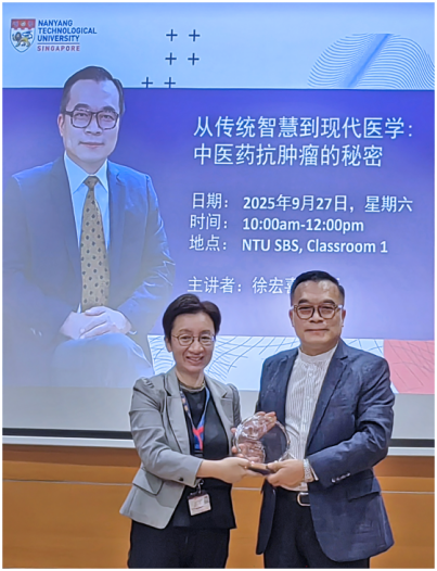 2025年9月27日,88娱乐城官网 首席教授徐宏喜受邀前往新加坡,获聘为南洋理工大学讲席教授,并应邀作题为《从传统智慧到现代医学:中医药抗肿瘤的秘密》的公众讲座。讲座在南洋理工大学生物科学88娱乐城 举行,吸引了当地学术界与公众的广泛关注。徐教授系统阐述了中医药在肿瘤防治中的作用,分享了其团队在中药抗肿瘤机制研究方面的最新成果。
