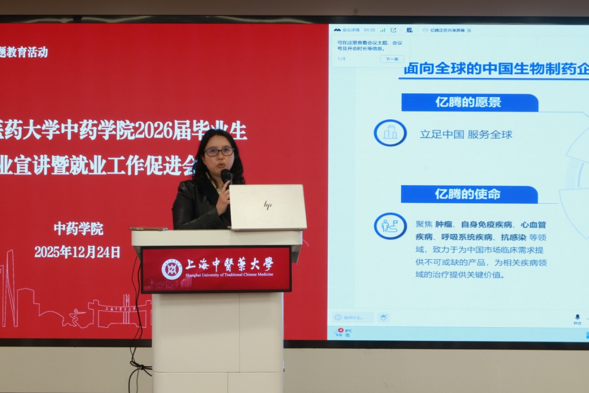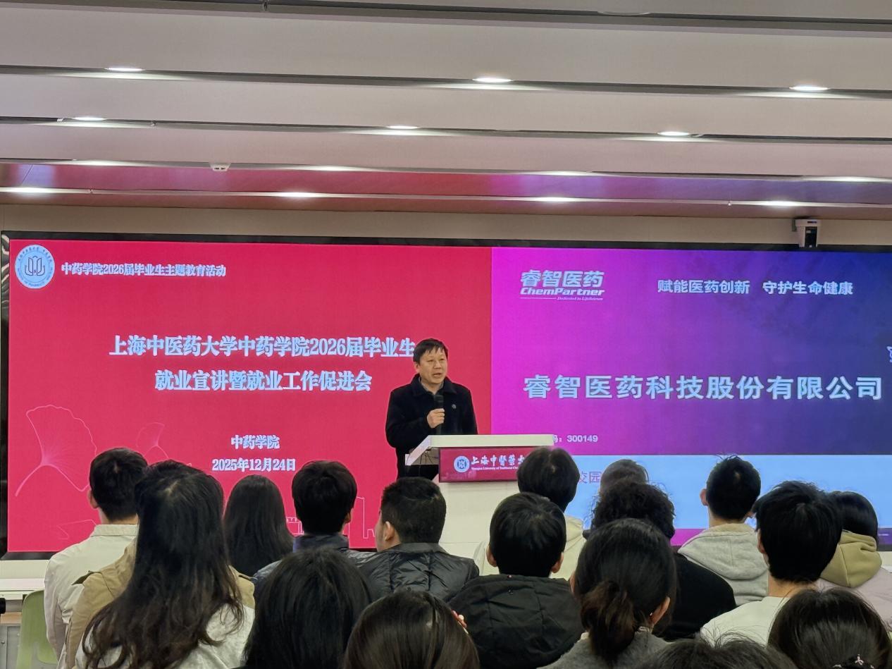 四家企业依次进行招聘宣讲。上海睿智医药研究集团有限公司作为具备“靶点至IND”全流程一站式服务能力的知名CRO企业,重点介绍了其在创新药物研发领域的深厚技术积淀、AI赋能研发的创新举措,以及面向毕业生的研发、技术支持等岗位需求。江苏先声药业有限公司作为国内创新型医药企业的代表,分享了公司在药物研发、生产销售等领域的核心优势与发展愿景,详细解读了校招岗位的任职要求、薪酬福利及晋升通道。南京圣和药业股份有限公司企业代表结合公司在中药及化药领域的业务布局,介绍了88娱乐城、团队建设理念,以及针对毕业生的多元化岗位设置与个性化培养方案。苏州亿腾药品销售有限公司则聚焦药品流通领域的发展机遇,讲解了销售管理、市场推广等岗位的职业价值与成长路径,为擅长沟通、关注市场的学子提供了清晰的求职方向。